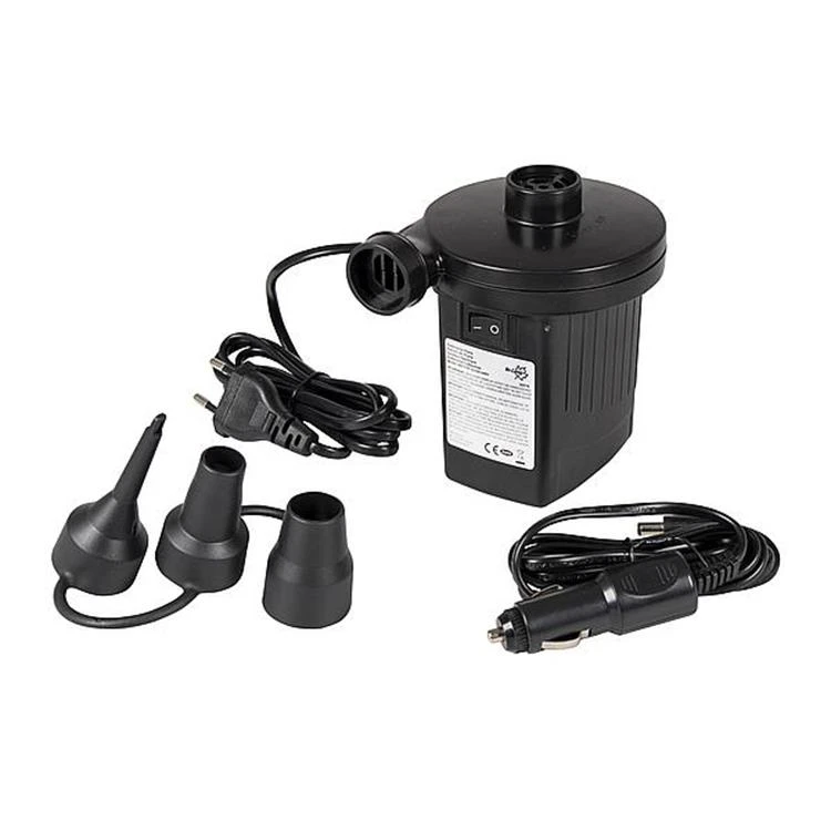 Een elektrische pomp, voor het opblazen en leeg laten lopen van een luchtbed, opblaasboot, speelgoed etc. Geschikt voor zowel een 12 Volt als een 230 Volt aansluiting. Deze pomp beschikt over een luchtstroom van 230 liter per minuut. Wordt compleet geleverd met verloopstukken en adapters.