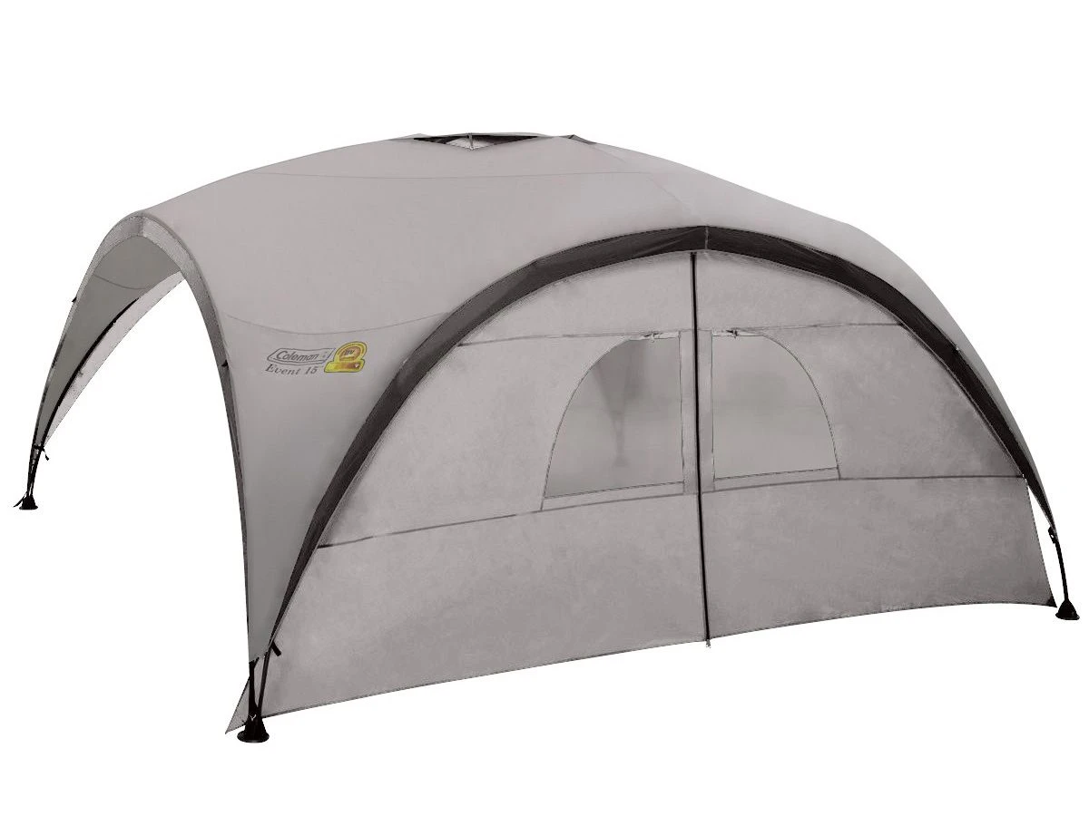 Zijwand voorzien van deur en ramen ten behoeve van de Coleman Event Shelter M. Deze lichtgrijze zijwand is eenvoudig aan het frame van de Event Shelter te bevestigen met clips.