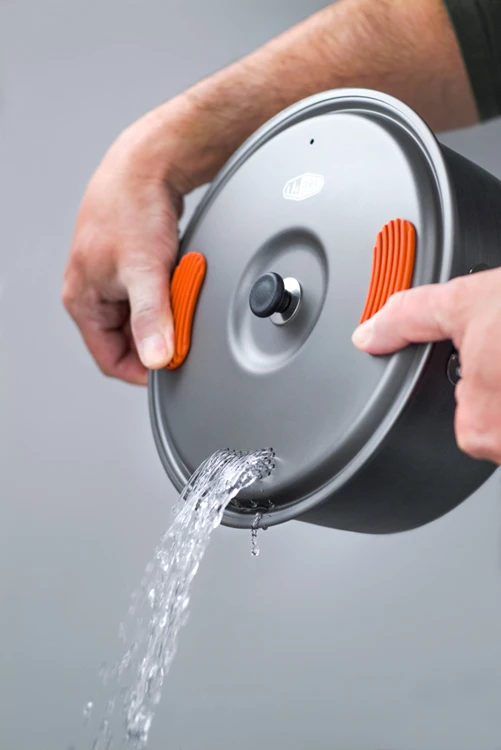 Met deze Halulite 2 L Cook Pot van GSI Outdoors was afgieten nog nooit zo gemakkelijk.De Halulite Pot is een geanodiseerde aluminium pan met inklapbare RVS handvaten. Beide handvaten klikken vast als deze worden uitgeklapt. Zo kan kun je makkelijk afgieten en worden de handvaten niet warm als de pan op het vuur staat.De deksel is voorzien van een geïntegreerde zeef en silicone pads. Zo kan je gemakkelijk de pan afgieten zonder je te branden. De pan is op de bodem voorzien van een spiraal-relief. Hierdoor blijft de pan stabiel op de brander staan.HaluliteHalulite is een krasvast materiaal, voorkomt zogenaamde hotspots en is zeer licht. Deze aluminium legering is net zo licht als titanium, maar geleidt warmte beter en gelijkmatiger. Dit bespaart brandstof tijdens het koken. Het aluminium wordt eerst gevormd en vervolgens geanodiseerd, zo ontstaat een kras- en slijtage bestendig oppervlak dat tegen een stootje kan.