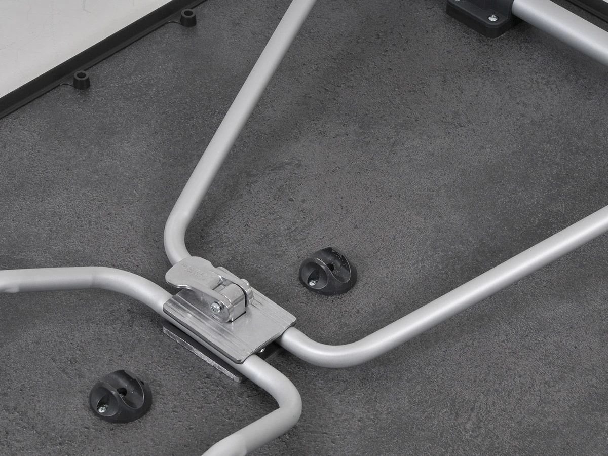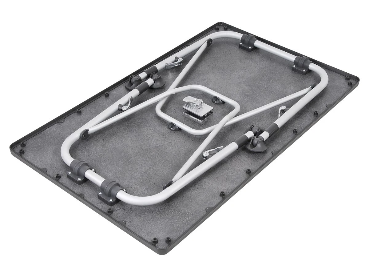 Deze campingtafel is zeer stabiel dankzij het traploos verstelbare frame en de grote voetplaten. Hierdoor is de tafel ook op iedere ondergrond stabiel neer te zetten. De tafelpoot verstelling en sluiting aan de onderzijde zijn vervaardigd uit aluminium om het gewicht zo laag mogelijk te houden.